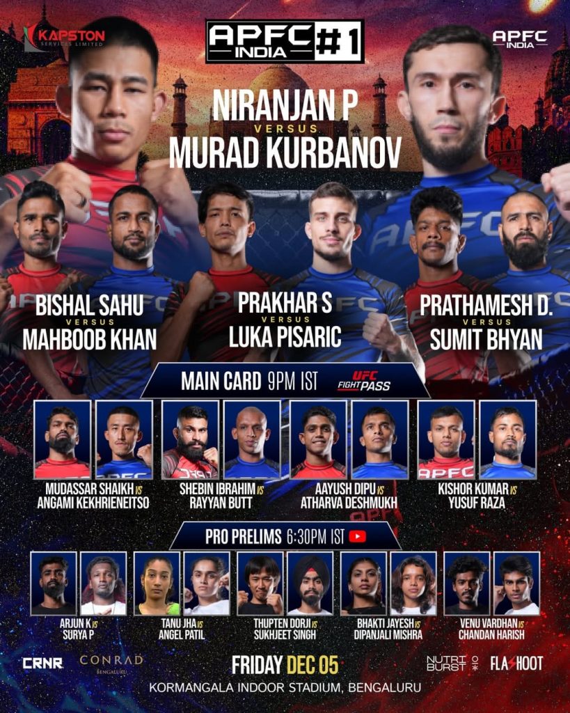 On December 5, 2025, Bengaluru, India hosted the very first Anthony Pettis Fighting Championship event on Indian soil. APFC India 1 also marked a historic milestone as the first fight night from India to be broadcast live on UFC Fight Pass, bringing international attention to the nation’s growing MMA scene.